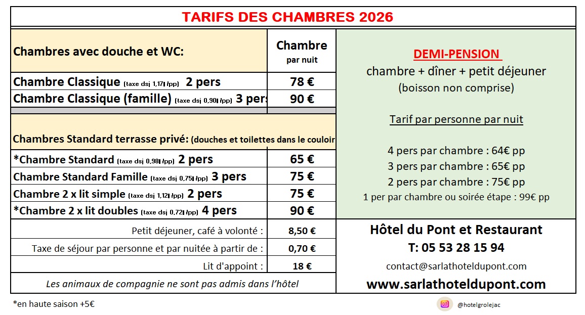 Télécharger notre tarif 2025 pour plus d’information et photos: cliquez sur le lien: Menu et Tarifs des Chambres ou Demi-Pension
